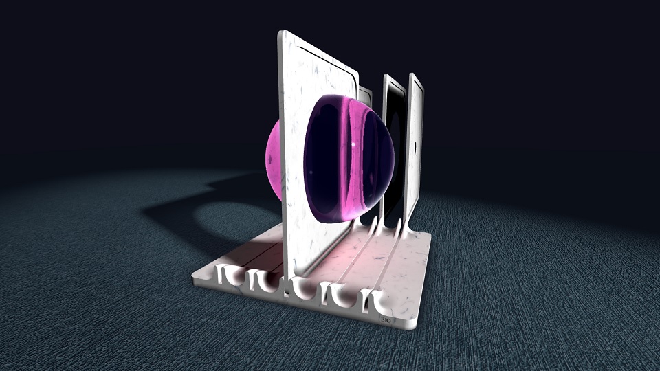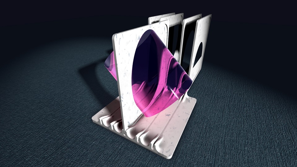 This is a virtual prototype of a model and collection of plates to demonstrate and explore cross sections of various solids. The solid is represented as a glassy object, although in reality it will be 3D printed too and it will be inserted into the plates, instead of just sliding the plates.